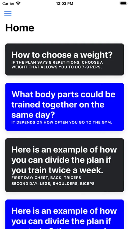 The ReigoGymPlan is intended for all those who go to the gym. There are three different variations of exercises for each muscle group, and tips on what muscle groups to train together.