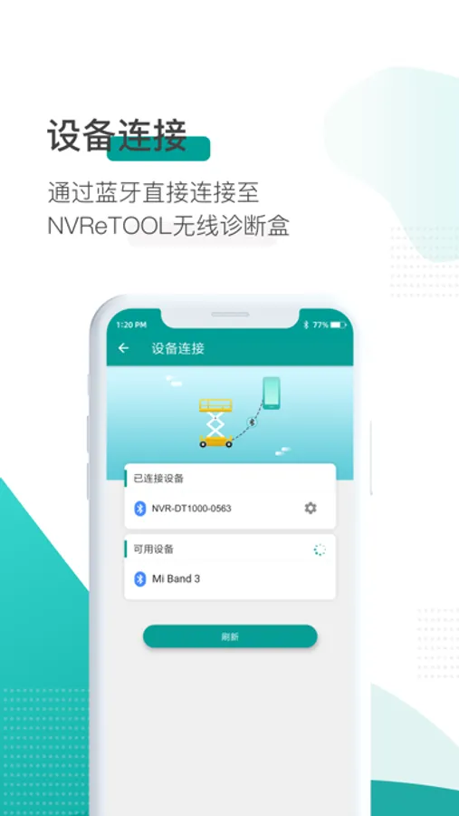 采用蓝牙连接方式,使用蓝牙直接连接NVReTOOL无线诊断盒,省去带线连接手机的方式,方便快捷。