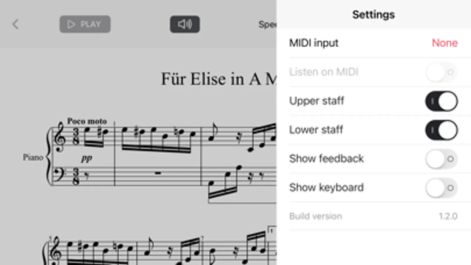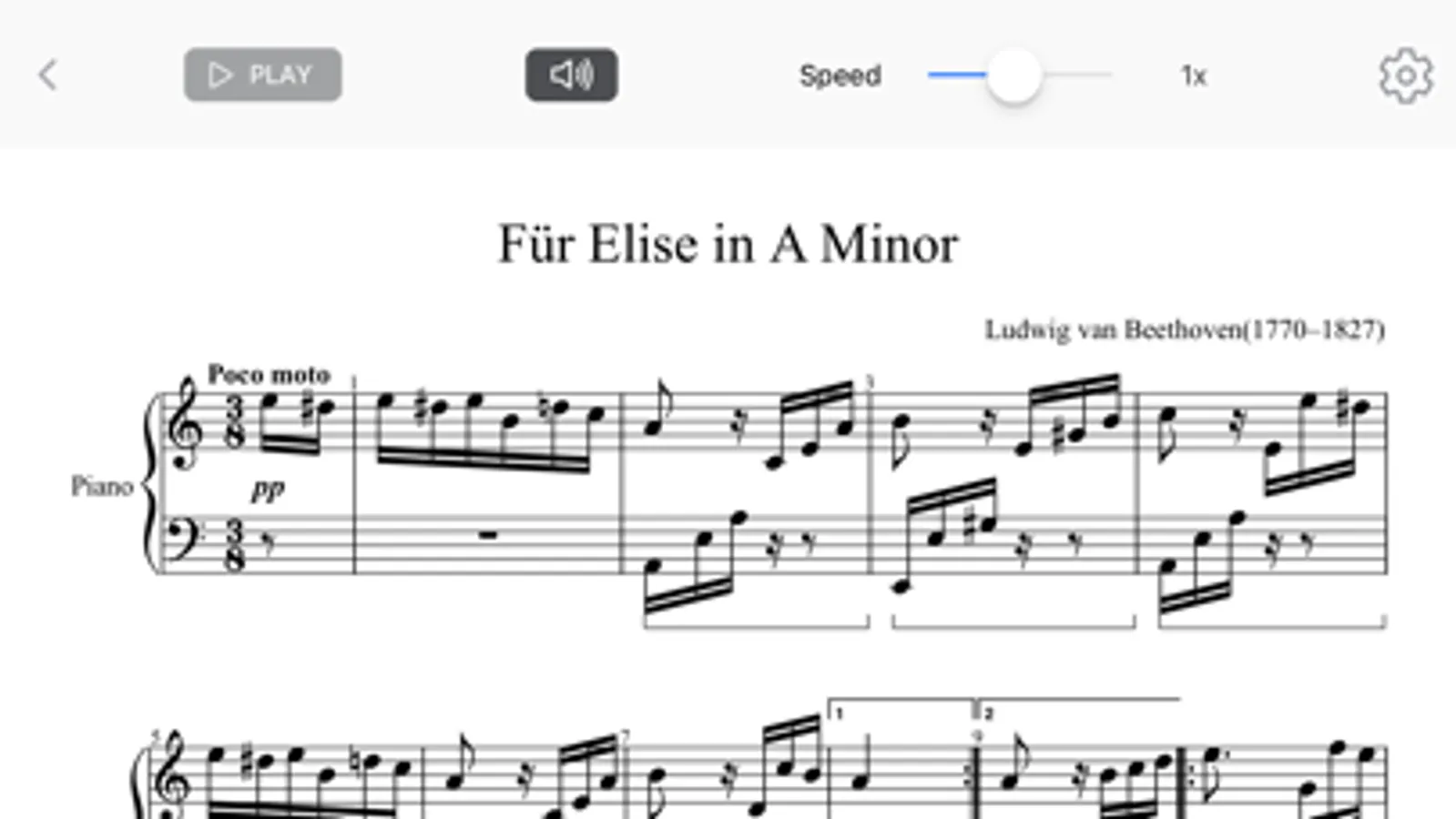 - Listen mode: The app will play the MusicXML sheet for you. You need to disable device's silent mode and tune up the volume first.