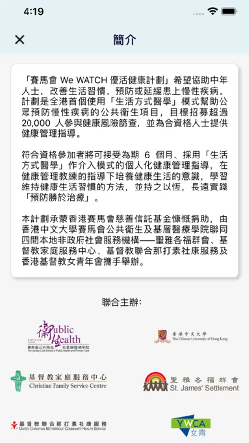 「賽馬會 We WATCH 優活健康計劃」希望協助中年人士,改善生活習慣,預防或延緩患上慢性疾病。計劃是全港首個使用「生活方式醫學」模式幫助公眾預防慢性疾病的公共衛生項目,於 2023 年至 2025 年期間進行,目標招募超過 20,000 人參與篩查,並為合資格人士提供健康管理指導。