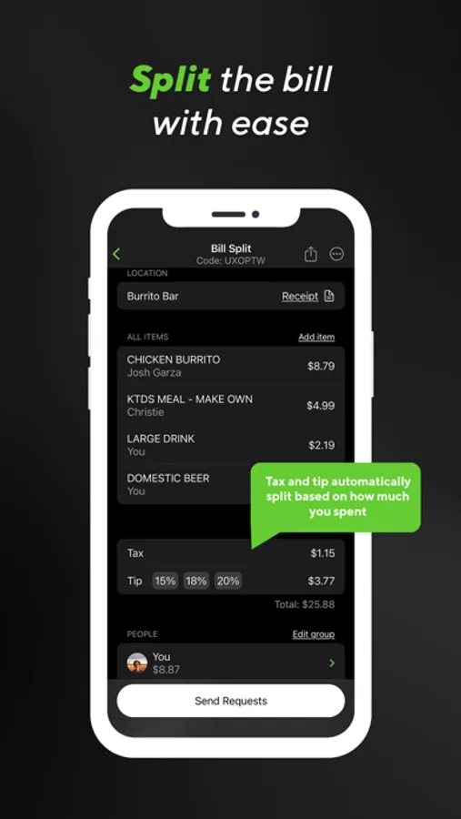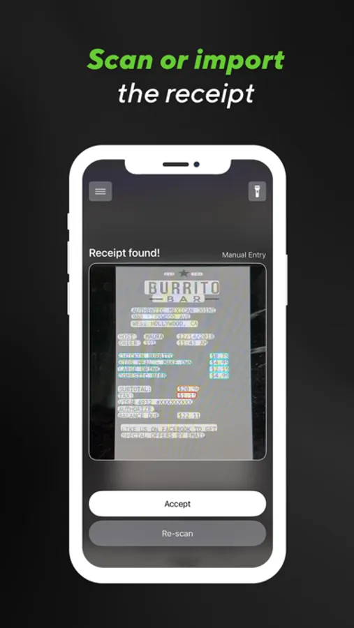 - Importing receipts from your camera roll: 1split will apply a high-resolution scan to images on your phone to detect receipt line items, tax and tip