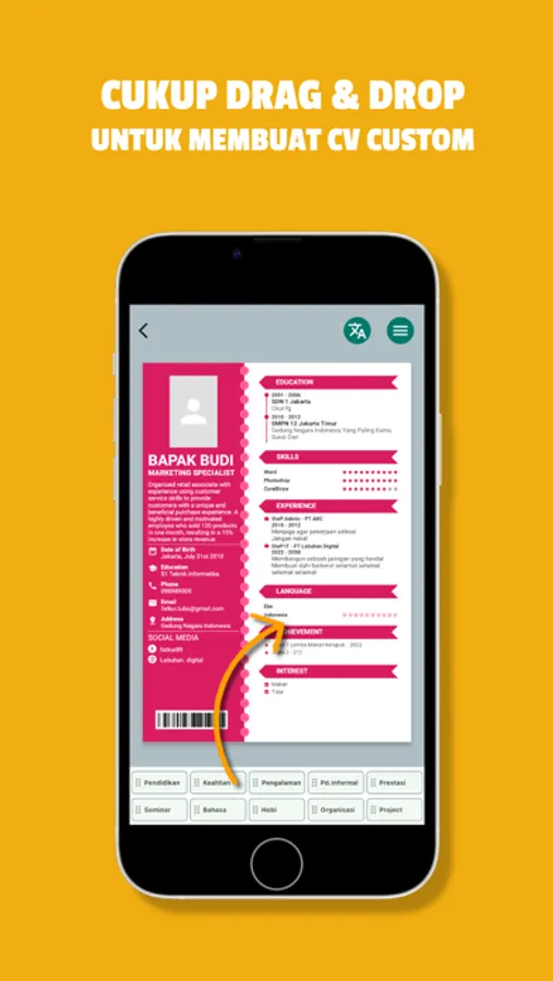 - Pembuatan CV/Resume sangat mudah, tinggal drag & drop,