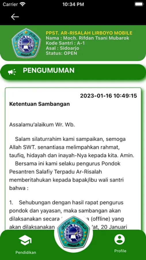 Aplikasi Ar-Risalah Lirboyo Mobile dibuat untuk memudahkan wali santri atau calon wali santri untuk mengakses informasi terkait PPST Ar risalah lirboyo Kota Kediri dan juga untuk memberikan informasi kepada wali santri agar bisa memantau keseharian Santri mulai dari keaktifan, Kesehatan, Pelanggaran, Pembiayaan Dll.