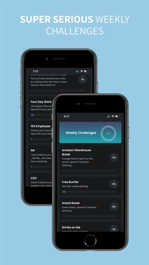 Strive to complete weekly challenges based on the time and money your earn while slacking.