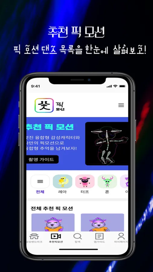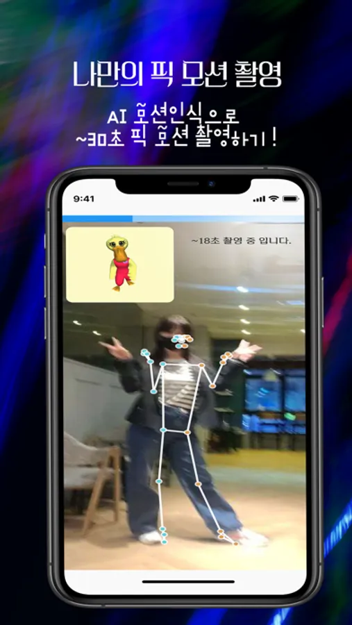 - 사용자의 모션을 따라하는 나만의 픽 모션(캐릭터)콘텐츠 생성가능.