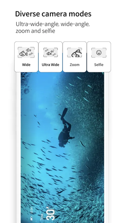 You can easily use the diverse camera angles underwater with simple buttons. It includes ultra-wide-angle, wide-angle, zoom and selfie.