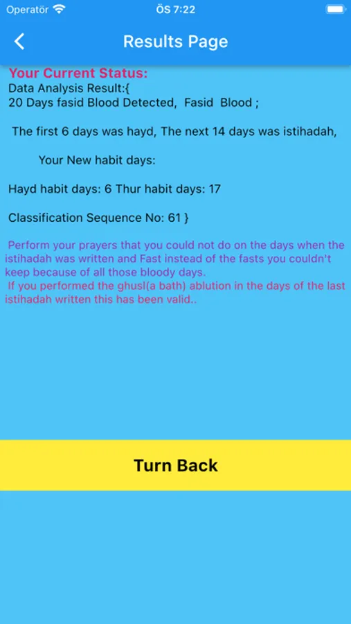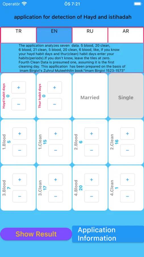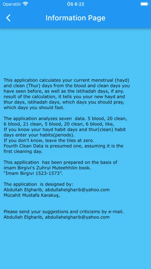This application calculates your current menstrual (hayd) and clean (Thur) days from the blood and clean days you have seen before, as well as the Istihaadah days, if any.