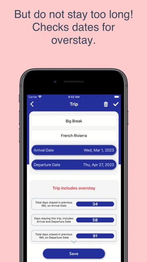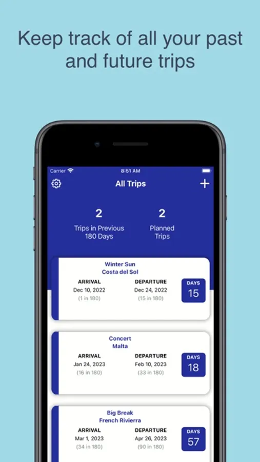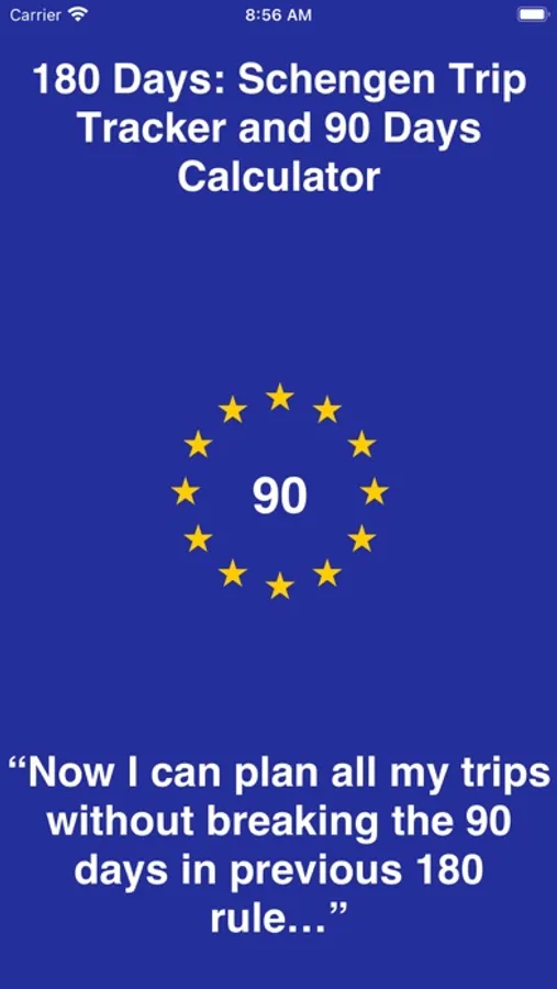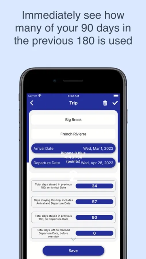 In 180 Days you can enter your past trips as well as your future planned trips. For each trip 180 Days will calculate how many of your 90 days you have used in the previous 180 for that specific trip, including on the arrival date and departure date. This means that even when planning a future trip you can immediately see how many days you will have used on your arrival date and departure date, giving you peace of mind that you will not accidentally overstay.
