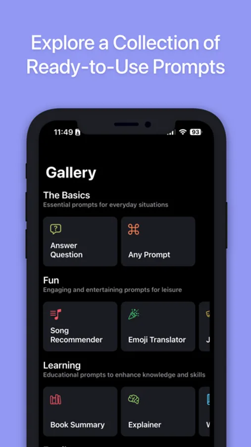 • Pre-made Prompt Gallery: Explore a curated collection of pre-made prompts that cover various scenarios. Save these prompts and make changes to suit your specific needs. With Promptastic, inspiration is just a tap away.