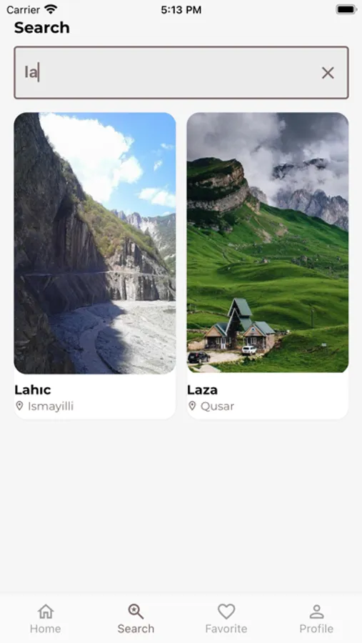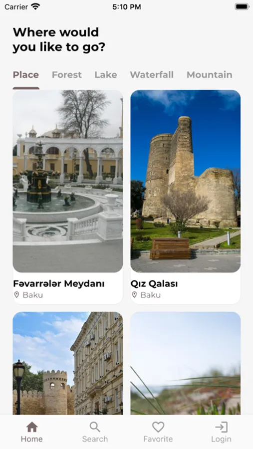 The first page of the application shows all the destinations divided into categories (place, forest, mountain, waterfall, etc.). By clicking on them, it is possible to see detailed information. You can also jump to the map by clicking the "Show on map" button. In the application, a dynamic search page is designed to easily find destinations. It is possible to register from the application using username/password, google and apple sign in methods. Registered users have the ability to favorite any destination and add a new destination. The application currently supports two language options (en, az). Various functionalities can be added to the program in the future. For example: writing reviews about destinations, loading guide information when entering the details of any destination, etc.