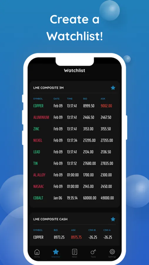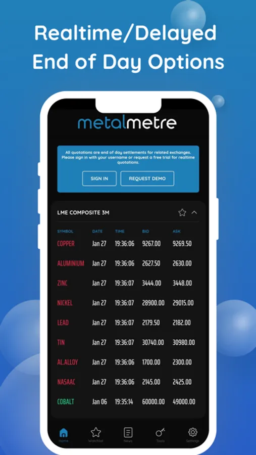 Realtime or 30 minutes delayed access to non-ferrous metal prices for London Metal Exchange (LME).