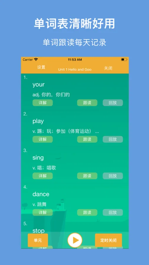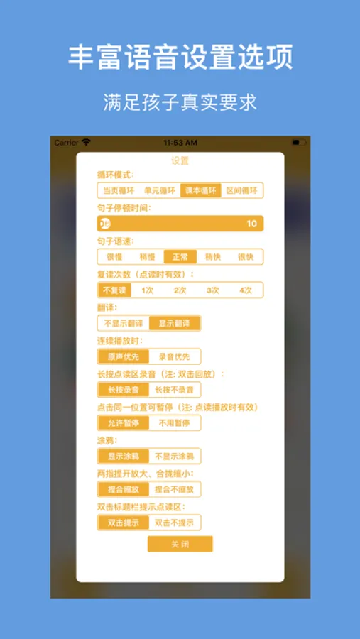 1、跟读模式:循环当页、循环单元、循环课本、区间循环
