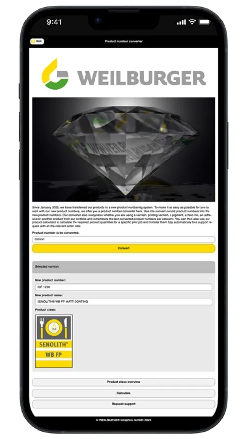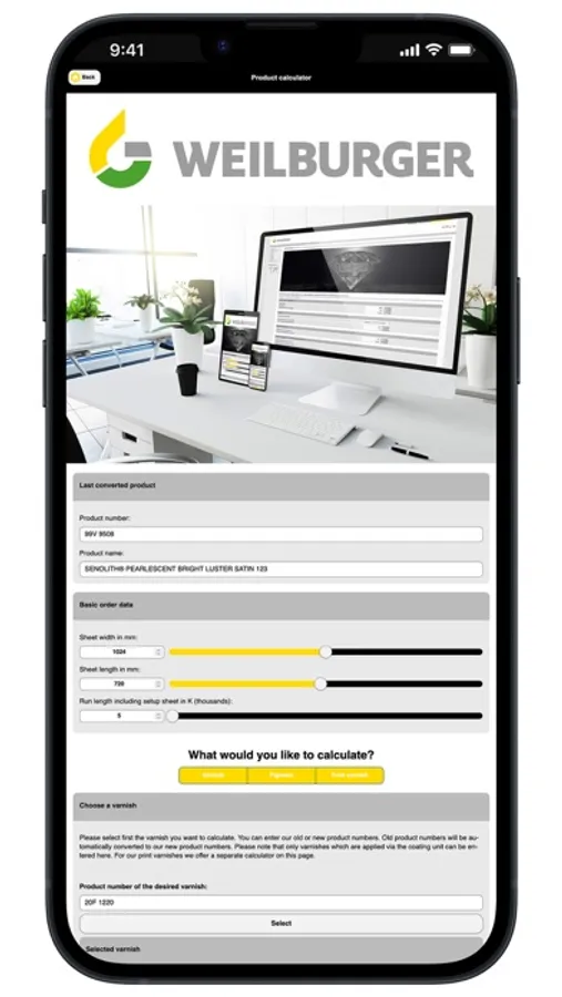 We have also greatly expanded the functional scope of the well-known and popular Weilburger paint quantity calculator for the company and integrated it seamlessly into the new Service App. This means that in addition to varnishes, you can now also comprehensively calculate printing varnishes and even pigments via the app in accordance with your planned production data. In addition, we have even integrated the selection of suitable anilox rollers - depending on the pigment selected - into the new app for the company, making it easier for you to plan production and calculate costs, even for the application of pigmented varnishes. Of course, the app also remembers all job-specific parameters for your print job and then summarizes all the information into a clear support request for you. You can even order the technical data sheets, safety data sheets and certificates for the products at the same time.