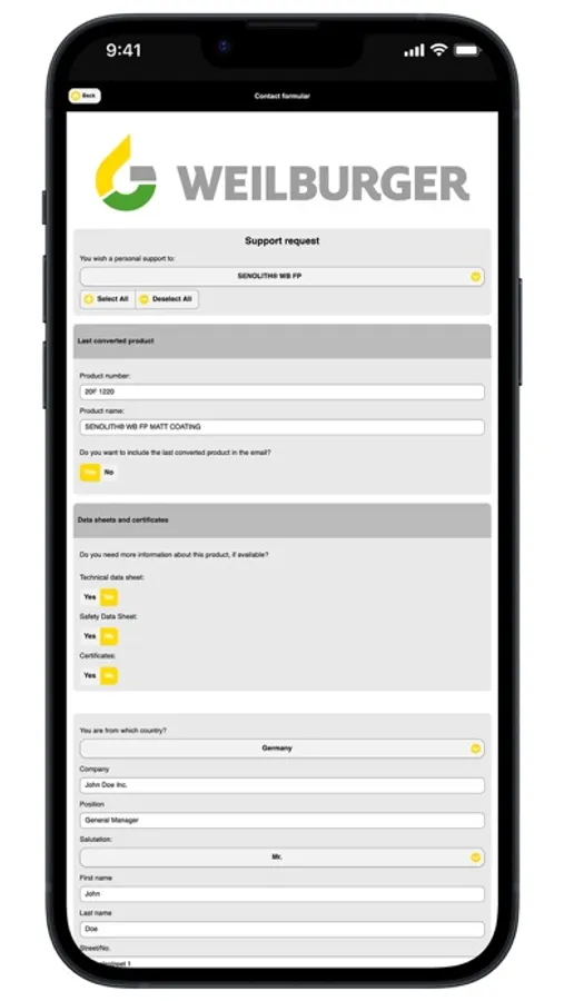 WEILBURGER Graphics GmbH offers you this app to expand its range of services. For this purpose, Weilburger has had the app equipped by us with a very extensive range of functions and has paid attention to maximum benefit in the daily use of their products. The Service App is designed to enable direct contact with the Weilburger sales and service representative responsible for you according to your company location. To do this, simply enter your contact data in the support menu and the app will automatically identify the contact person responsible for you and saves this data. From then on, you can communicate directly with your personal support representative. The company has deliberately avoided cloud-based communication and uses only the local memory of your end device and the GDPR-compliant communication channel via your standard email client. This gives you full control over your communication and you can also find the support requests generated from the app in your mailbox or CRM system at any time.