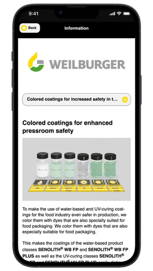 The goal of WEILBURGER Graphics GmbH as your supplier for high-quality coatings, flexo inks and adhesives and your reliable service partner is to offer you the fastest and easiest support per request and order, and the company and we hope that you and your employees will learn to appreciate and love the new WEILBURGER Graphics Service App in daily use.