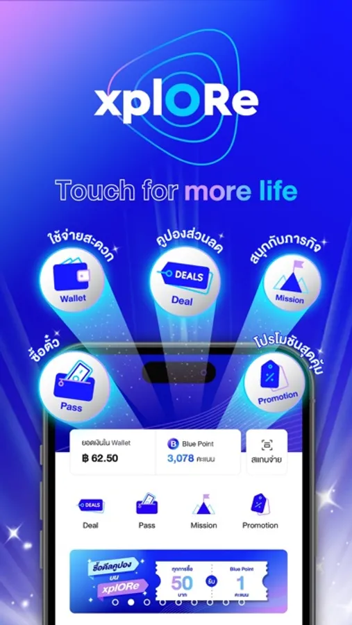 แค่โหลด xplORe แอปเดียว ชีวิตนอกบ้านก็จะง่ายกว่าที่เคย เชื่อมต่อทุกบริการ ทั้งการซื้อดีลคูปองส่วนลดร้านอาหาร ตั๋วท่องเที่ยว ความบันเทิงในราคาสุดคุ้ม รวมถึงการใช้จ่ายอย่างไร้รอยต่อ ด้วย e-Wallet อีกทั้งยังสามารถสะสมคะแนน Blue Card และนำไปแลกรับสิทธิพิเศษจากคู่ค้าชั้นนำได้อีกเพียบ