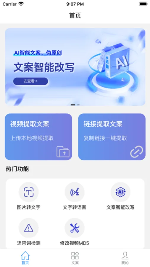 “文案提取改写”app 结合了文案提取,文案改写,文字转语音,去各大短视频平台水印,修改MD5和敏感词检测等多种功能,一个app实现文案梦想!