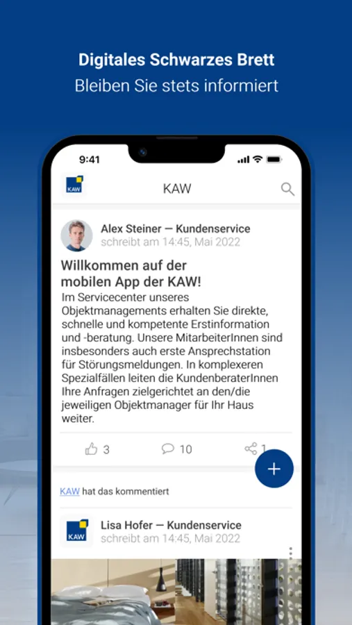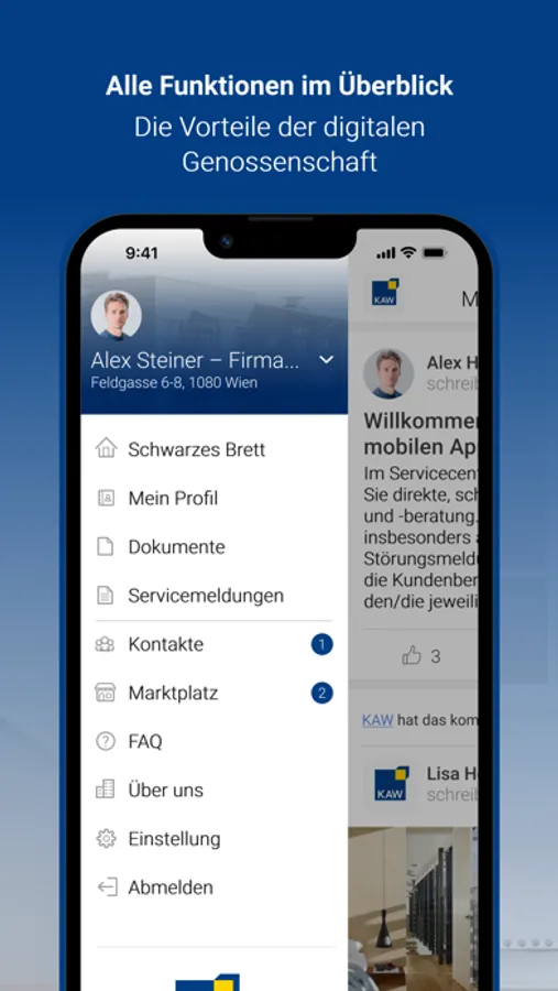 Als Kunde der Bau-, Wohnungs- und Siedlungsgesellschaft Kirchberg am Wagram, gemeinnützige Gesellschaft m.b.H. profitieren Sie von einem besonders innovativen Kundenservice, der Ihnen viele Freiheiten bietet. Mit der KAW App können Sie uns rund um die Uhr Anliegen und Schäden inklusive Fotodokumentation per Smartphone melden. Zusätzlich stellen wir Ihnen eine digitale Dokumentenmappe mit wichtigen Dokumenten für Ihre Immobilie(n) zur Verfügung. Über das digitale schwarze Brett informieren wir via Push- Nachricht proaktiv über wichtige Informationen rund um die uns anvertrauten Immobilien.