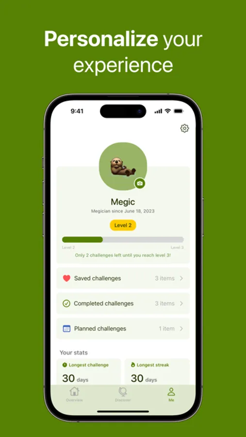 Ignite your potential with megic, the ultimate challenge companion! Create custom challenges, track daily progress, and find inspiration from a vast collection of pre-defined adventures. Crush your goals, unlock achievements, and embrace personal growth. Download now and embark on an exciting journey of self-improvement. Join our vibrant community of achievers and start conquering challenges today!