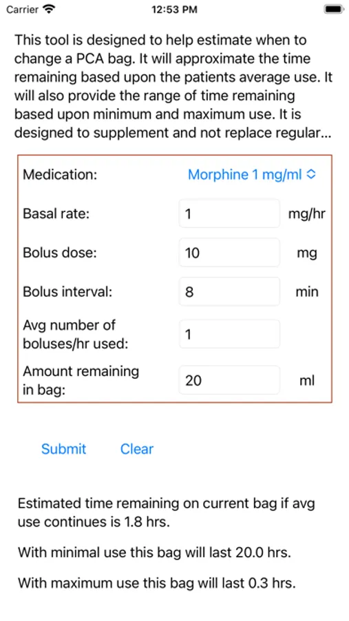 Helps medical professionals determine when to change a PCA bag by calculating time remaining based on patient's average use.