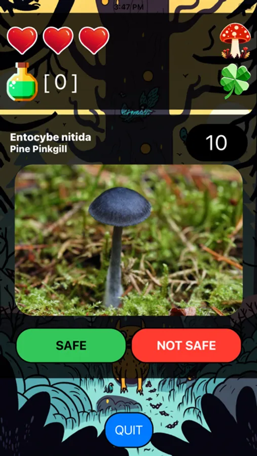 Uncover a mysterious narrative as you answer trivia to survive in the wild. Identify edible vs. poisonous mushrooms, treat symptoms, and unlock journal pages revealing secrets of the forest.