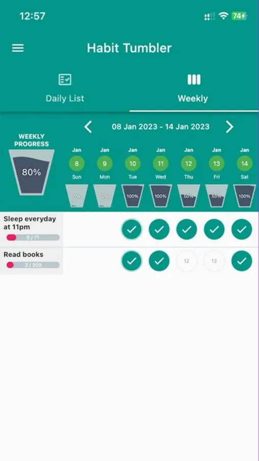 We use an animated tumbler with water for showing the progress of your habits. You will surely try to fill the tumbler for the day and week.