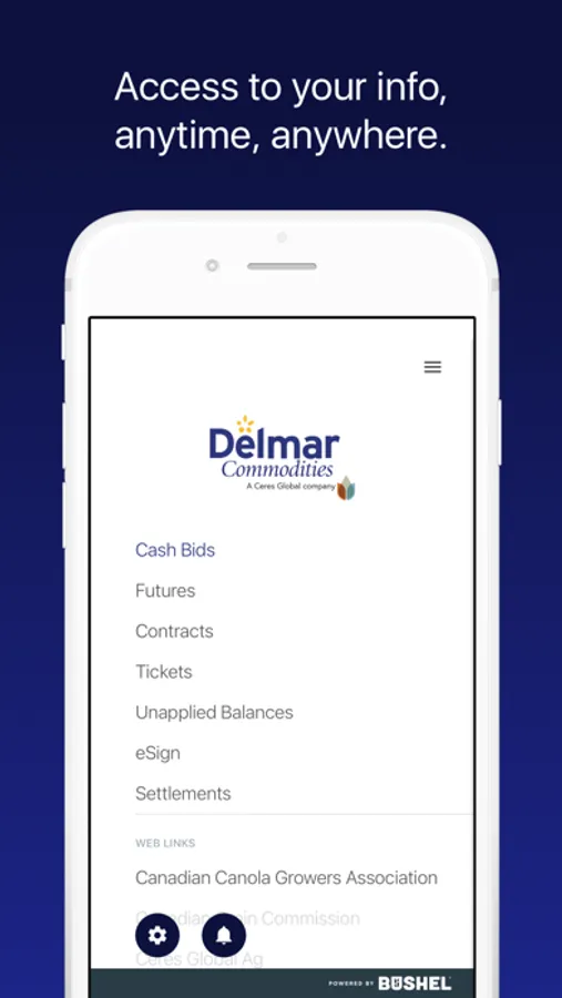 The Delmar Commodities app is free, secure, and developed by the industry-leading Bushel platform.