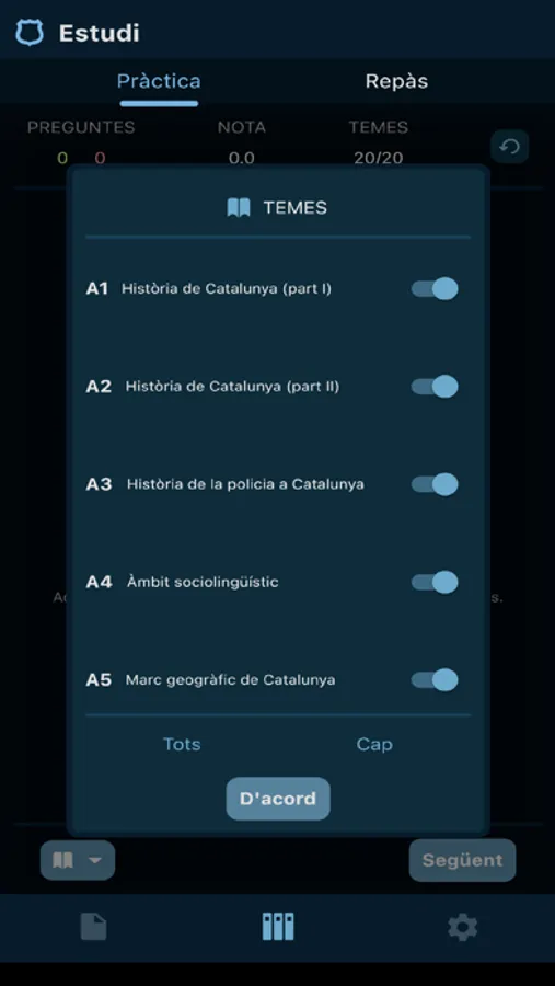 - Podràs revisar els temes que portes millor i pitjor i comparar la teva nota amb la nota mitjana de la resta d’usuaris.