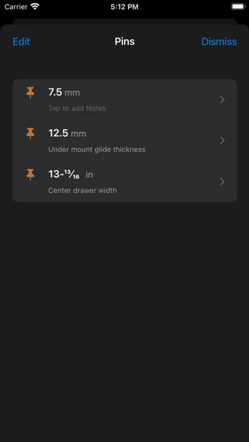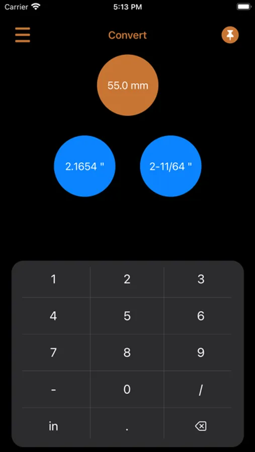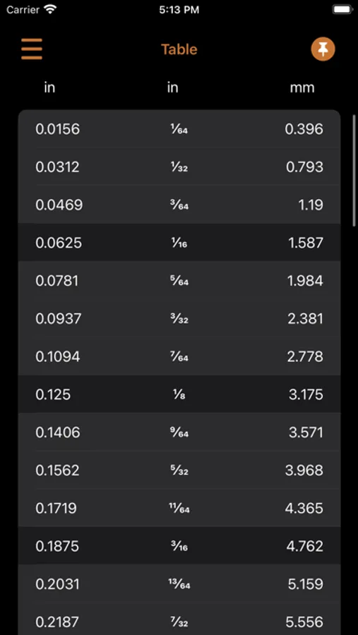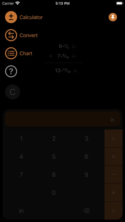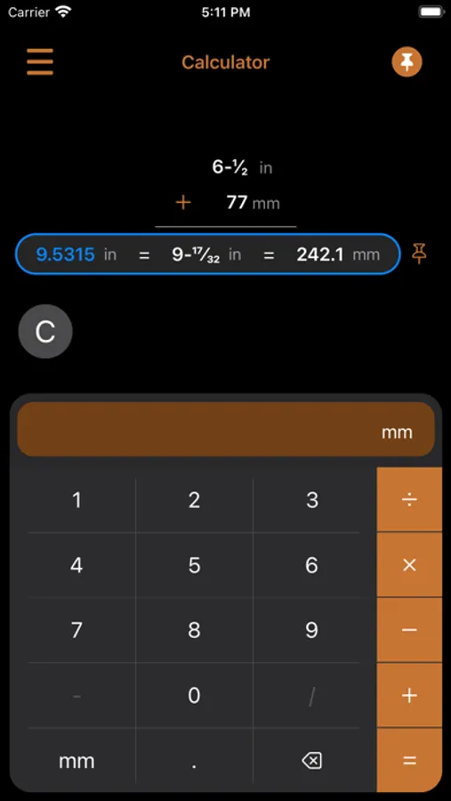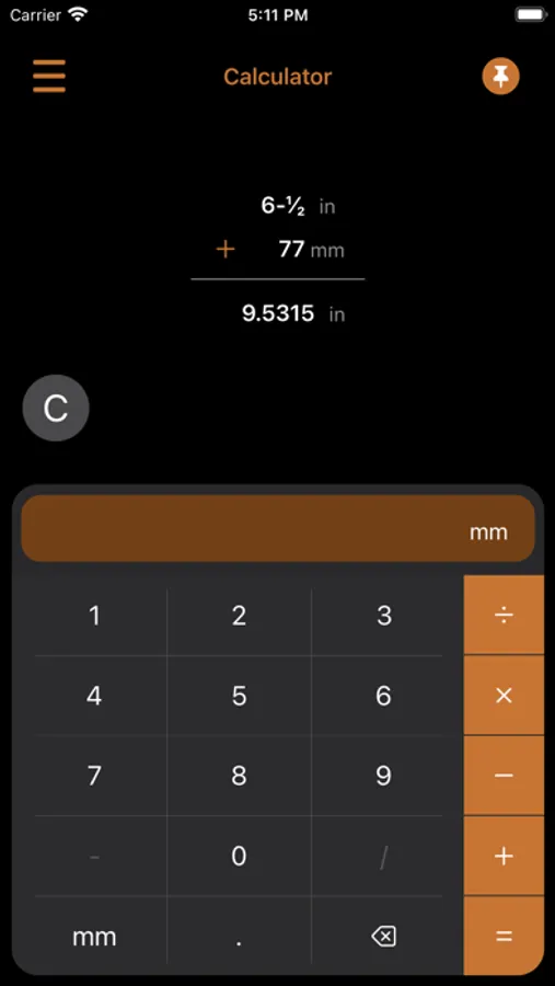 With the "Calculator" tool you can execute calculations across standard decimal and fraction values (in inches), as well as metric values (in millimeters). In Addition, you can tap on any value in the "transcript" output to see its equivalent in the alternate unit type/style. If you tap the icon next to a value you can add that value to the "Pins" view, which can be seen by tapping the icon in the lower right portion of the transcript view.