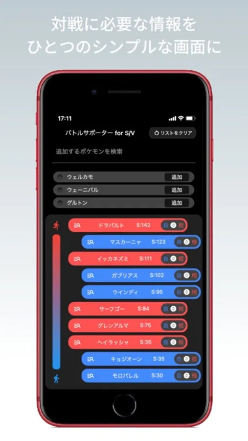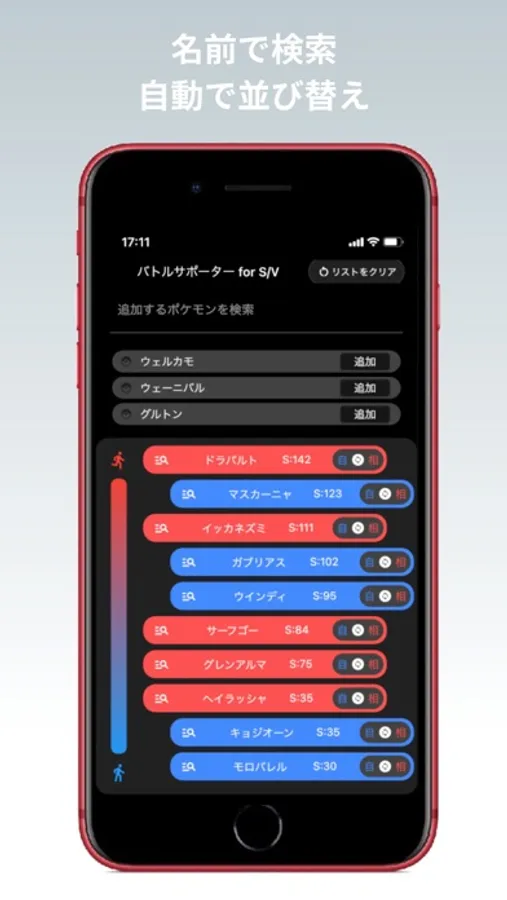 ポケモンを名前で検索、追加してポケモンの行動順リストを生成できます。