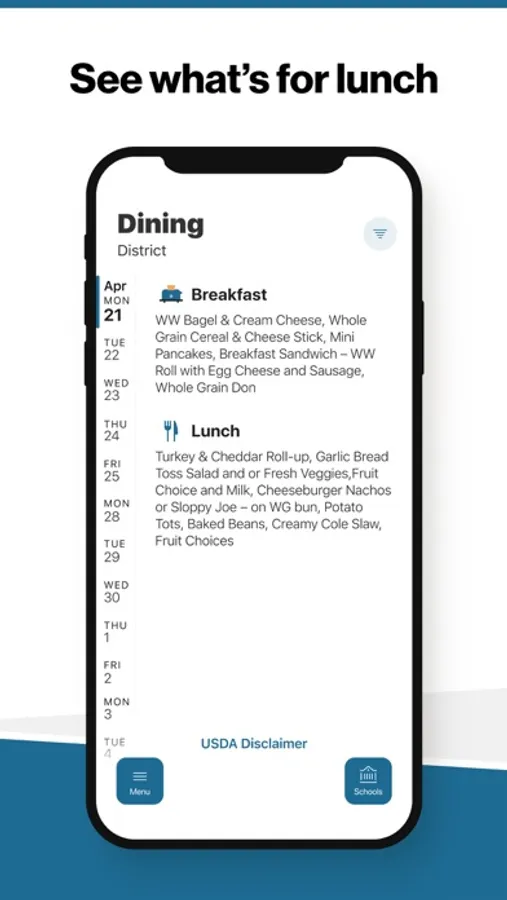 Within the dining section, you'll find an easy to navigate, weekly menu, sorted by day and meal type.