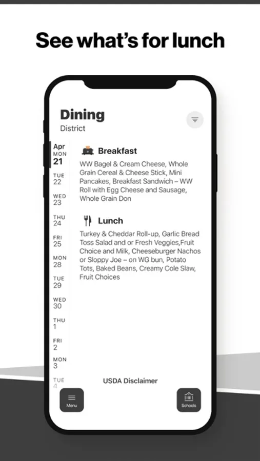 Within the dining section, you'll find an easy to navigate, weekly menu, sorted by day and meal type.