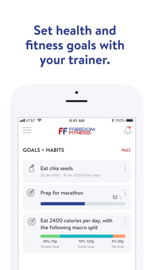 With the Freedom Fitness App, you can start tracking your workouts and meals, measuring results, and achieving your fitness goals, all with the help of your personal trainer.