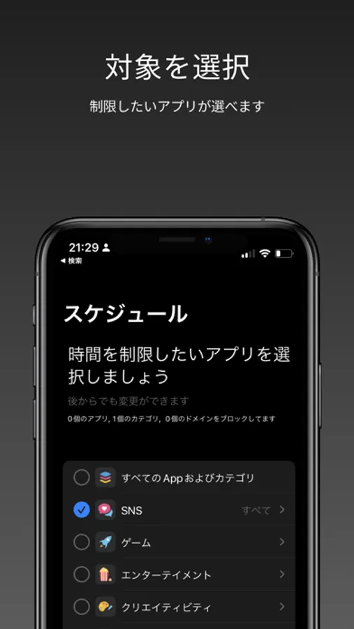 ・制限したいアプリと時間を設定することで作動します。例えば仕事や勉強中の9:00-17:00の間はSNSは使用しないと言った設定ができます。また10分だけ許可するといったことも可能です