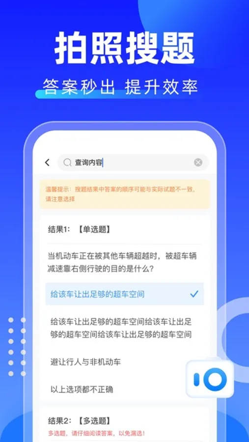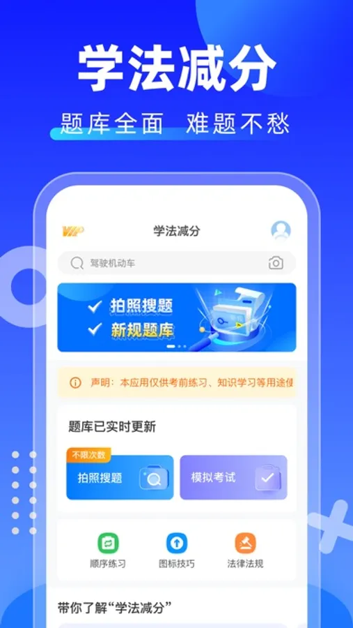拍照搜题:实时同步各地区学法减分新规题库,每日更新试题及解析,准确率高,搜题速度快。