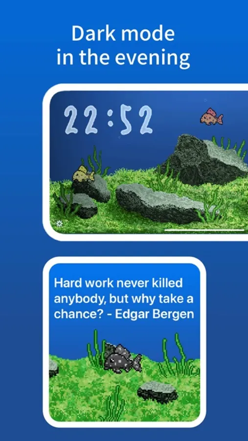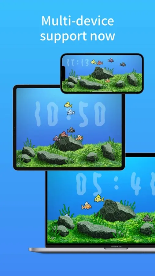 The fish tank is drawn in 2D pixel art. It provides fish with 6 different colors. You can select your favorite fishes to display. The clock inside the background offer 24/12-hour mode, you can also choose to hide the clock.
