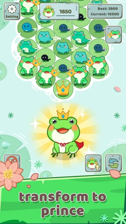 Frog Prince Transforming is a merging puzzle game with simple and casual art. Keep tapping and evolve tadpoles to frogs. Then just wait them to surprise you with some treasure from the pool! Collect crowns to transform a frog to a frog prince!