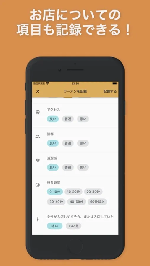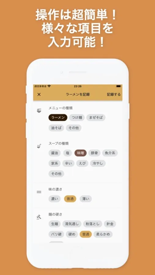 You can record detailed information about your ramen, such as the taste, soup, noodle hardness, and intensity of flavor.