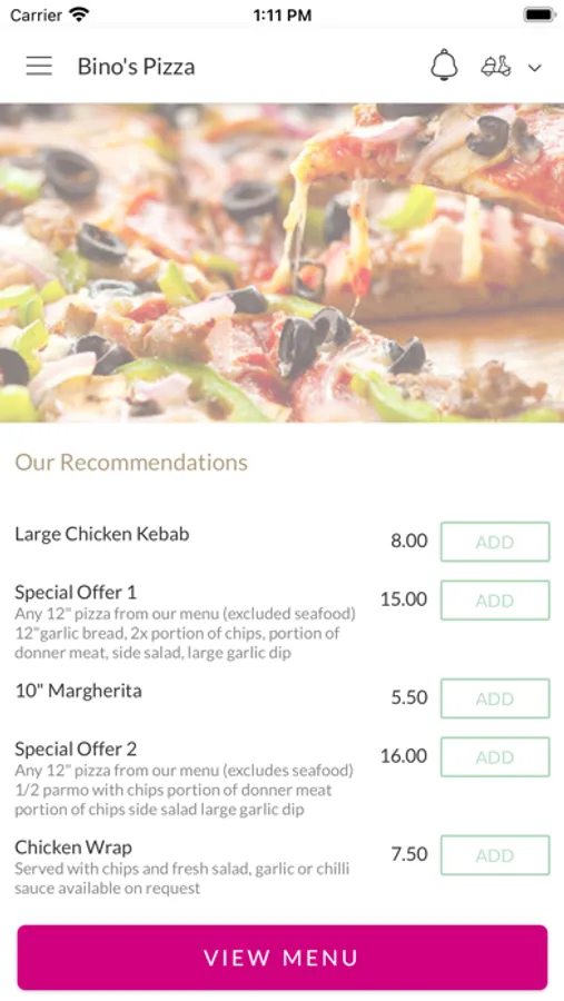 Here at Bino's Pizza, we serve a variety of food such as pizzas, burgers, wraps, kebabs and more.