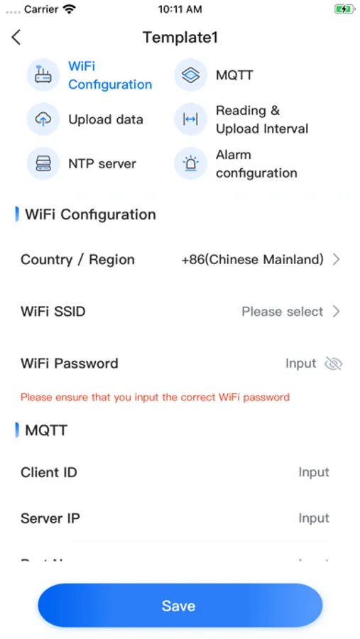 1. Smart Sensor device: Convenient for users to quickly configure smart sensor devices on their mobile phones: basic information, WiFi information, MQTT channel information, upload data items, upload interval time, NTP server information, alarm configuration information, parameter configuration information. You can also restart the device, restore factory settings, manually synchronize, and set device item templates.