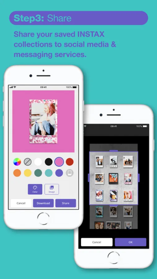 Use the INSTAX UP! App to easily share your saved INSTAX photos & collections to social media and messaging services.