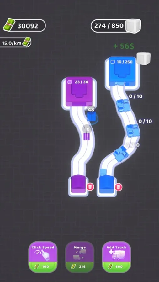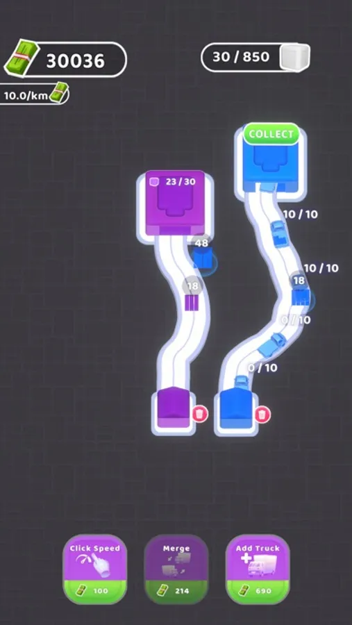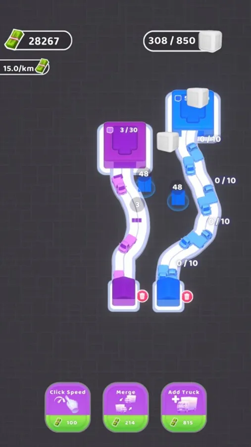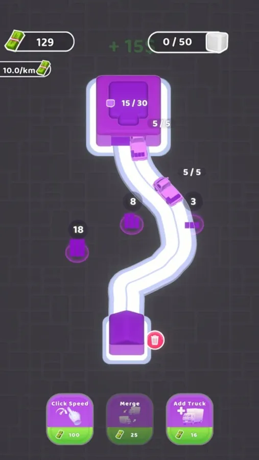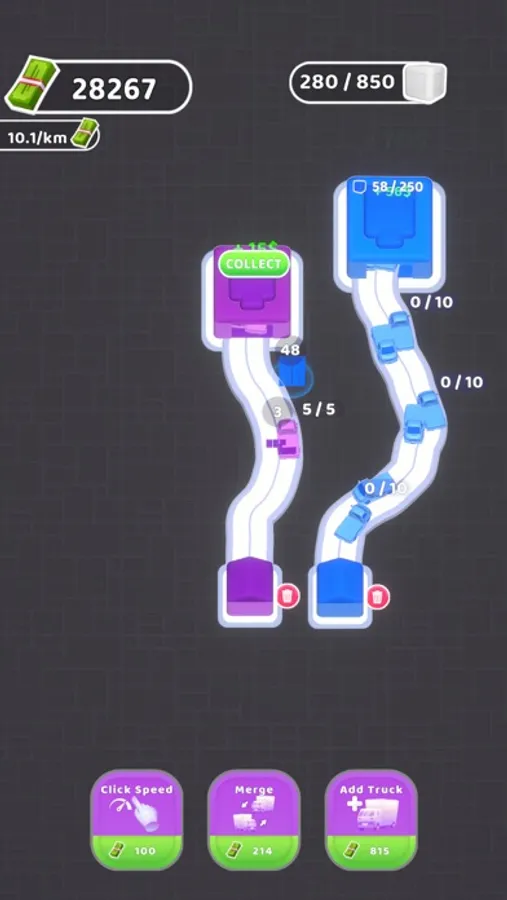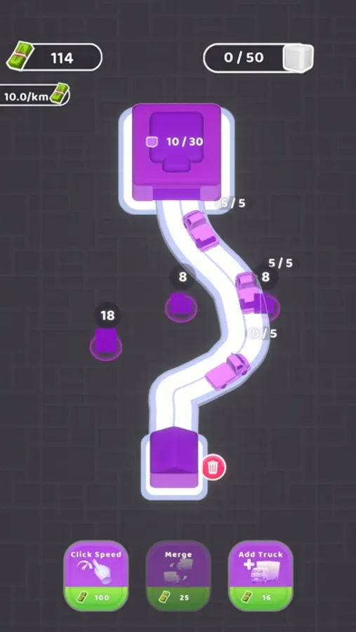 Transport Titans is a truck simulation game where you manage your trucks to collect boxes and deliver them to the center. You can purchase new vehicles and upgrade them to higher level vehicles by combining them.