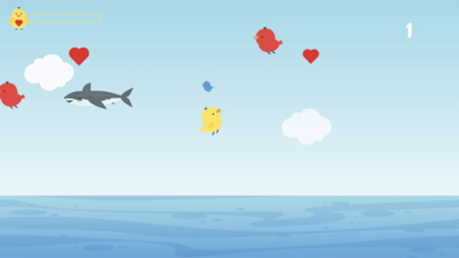 Rush towards your touch to absorb the life-boosting heart and reunite with the flock of baby birds, keeping an eye out for the red birds and sharks that eat the cubs and reduce your bird's life.