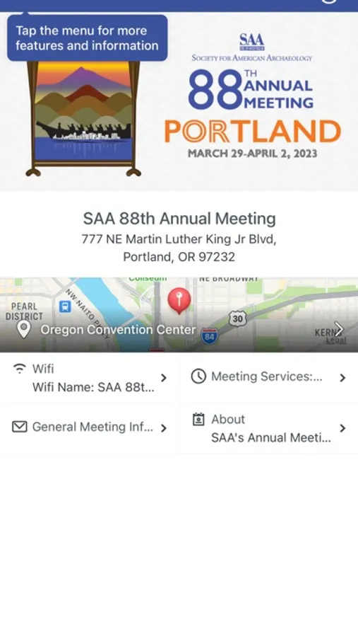 This is the official App for the 88th Society for American Archaeology (SAA) Annual Meeting held in Portland, Oregon from March 29 - April 2, 2023. With this App you will be able to view the entire schedule as well as personalize your own schedule, examine the extensive list of speakers and exhibitors, receive updates on last minute changes, see what events are going on now as well as within the next two hours, and explore the exhibit hall with an interactive map. You will also be able to find maps and learn about Portland’s city life all in the palm of your hand!