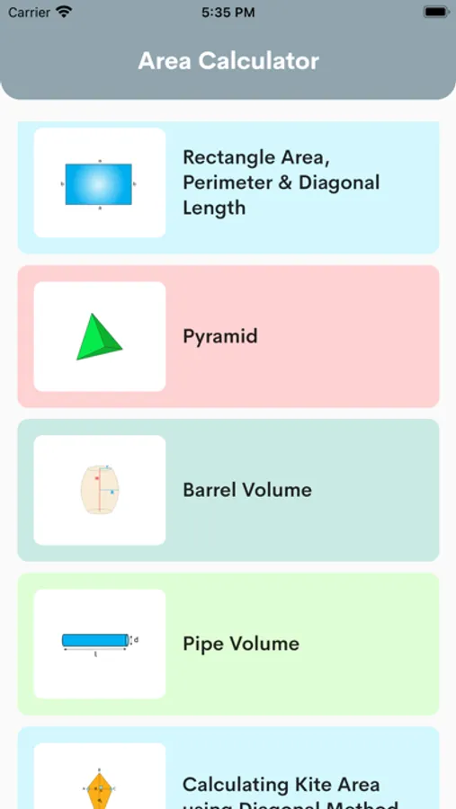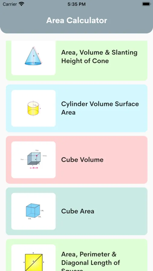 The shape of the volume includes common cylinders, cones, prisms, spheres, Cuboid Volume & Surface Area, Rhombus Area & Perimeter, Ellipse Area, Perimeter & Volume, Cylindrical Silo Volume etc.