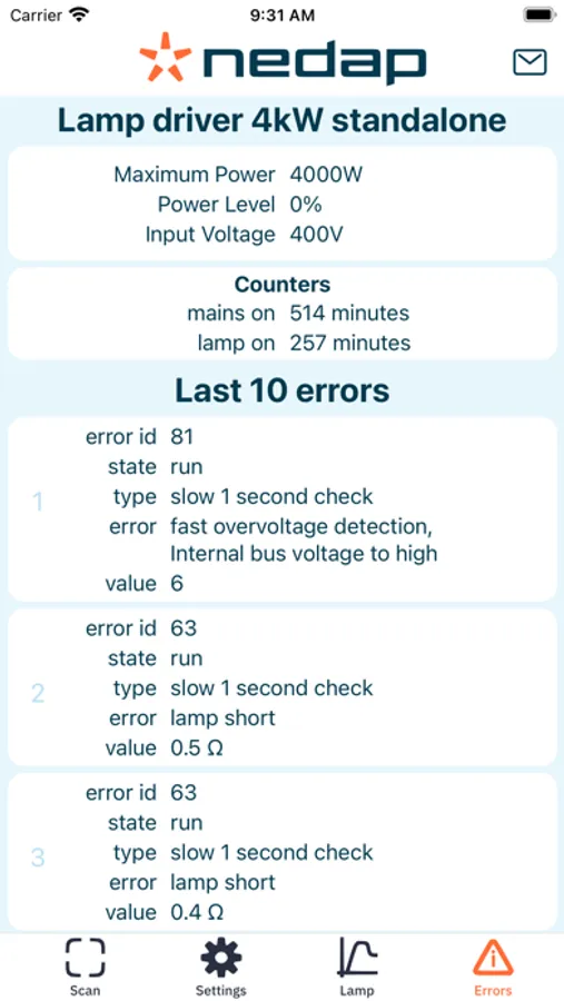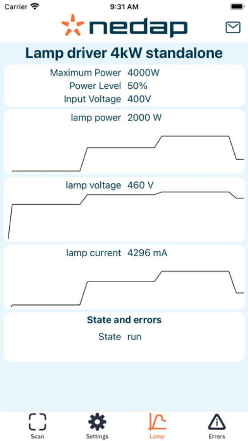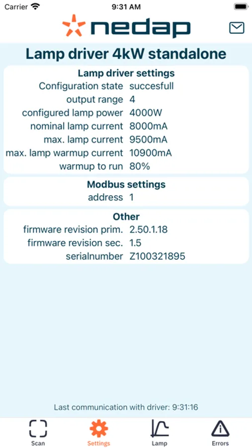 Rapid troubleshooting is critical to ensure minimal downtime of UV systems. Access all UV lamp driver measurements with real-time monitoring, alerts, diagnosis and fault finding on-site. Get instant access to performance information and insights of individual UV Lamp Drivers, without disrupting the operational processes controlled by Modbus. The app works with Nedap’s 4 kW lamp driver platform.