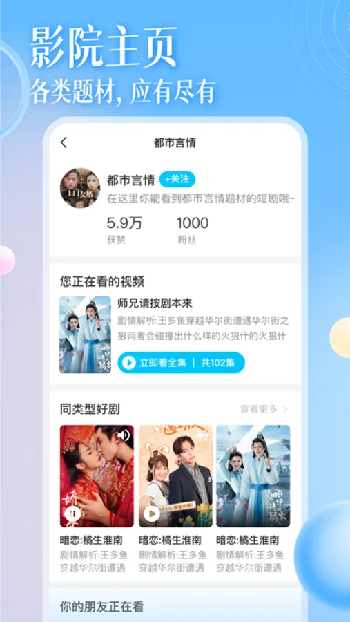 超多短剧在线观看! 重点品类,每段视频都好看! 大屏模式:全新播放体验,观看视频更为沉浸。 【轻松有收获】 畅享海量丰富短剧,你想看的这儿都有。 【好看有营养】 精彩视频超清播放,想怎么看就怎么看。 【无限新体验】 精彩短剧、短视频,更多选择,更多好看。