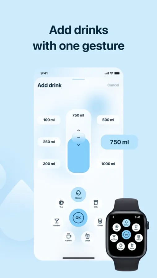 The app does not read or analyse health data. It can only add the number of millilitres of water you have drunk and the date when you added it.