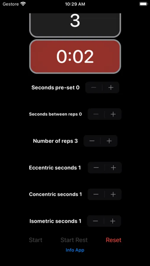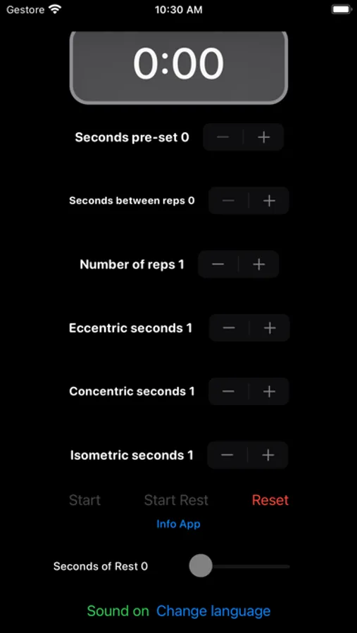 This app will let you perform sets with a pre fixed tut more easily by counting reps and seconds in each phase of the contraction for you. It will do it both with the change of the color and the change of the sound. Brown = Eccentric, Red = Isometric, Green = Concentric. Set some seconds pre set to position before the set and the app will let you know when to start. If you set all seconds to 0, you will have 2 seconds to perform each rep. Good Workout