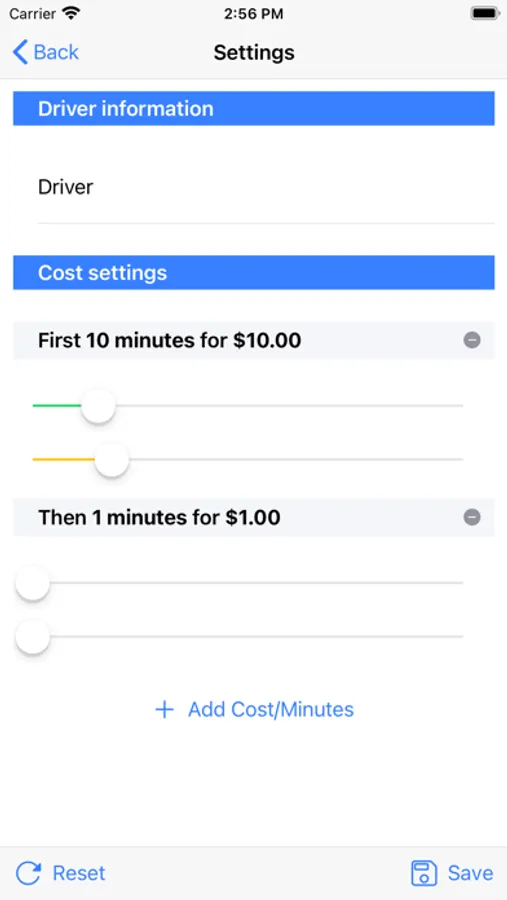 Settings gives users the ability to set the driver's name as well as two time levels for charging riders. For example, they can set a charge of $15 for the first 10 min of a ride and then $1 per minute after that.